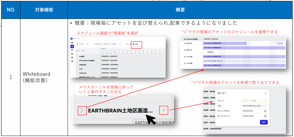 ・現場毎にアセットを並び替えられ、配車できるようになりました。